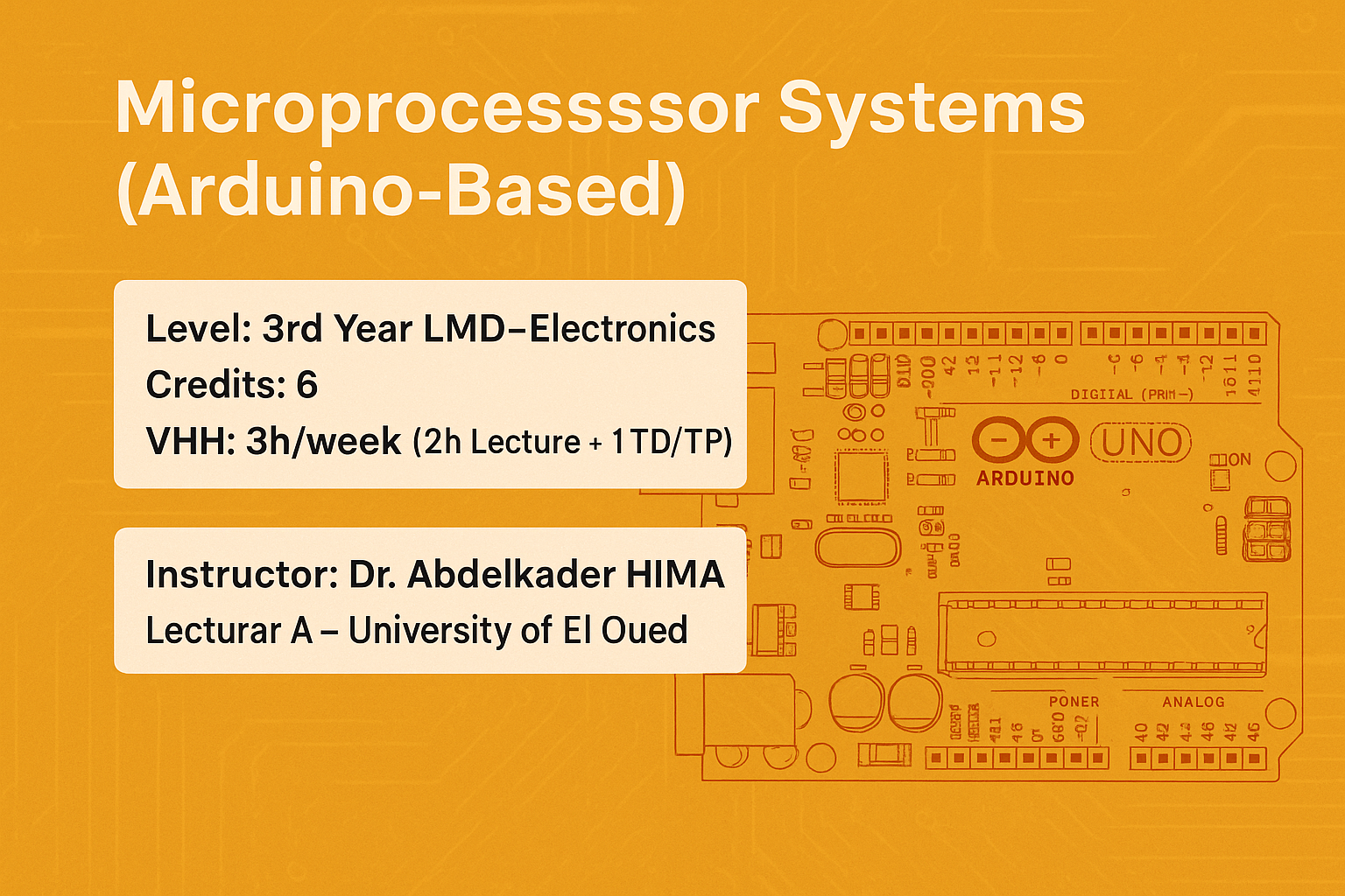 This course introduces students to the fundamental concepts of microprocessor systems and their applications in embedded electronics. Through theoretical lessons and practical examples based on the Arduino UNO platform, students will acquire skills in understanding, programming, and interfacing microcontrollers with peripheral devices. The course bridges the gap between computer architecture and electronic system design.